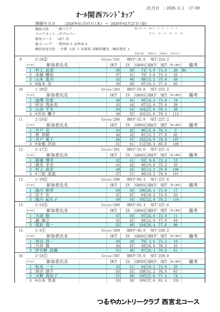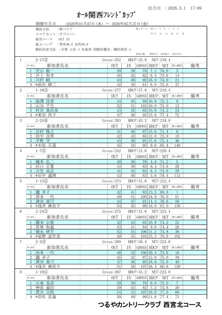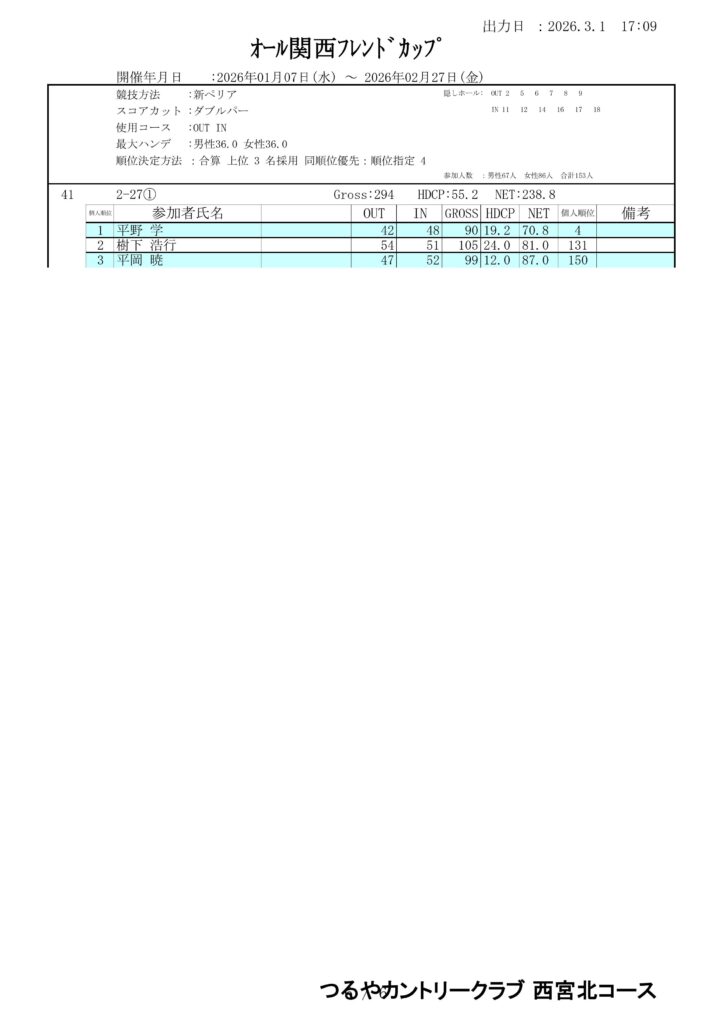 第13回オール関西フレンドカップ成績表